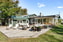 Längs framsidan löper ytterligare ett trädäck i två avdelningar, ett med loungemöbler och ett med matbord i anslutning till köket.