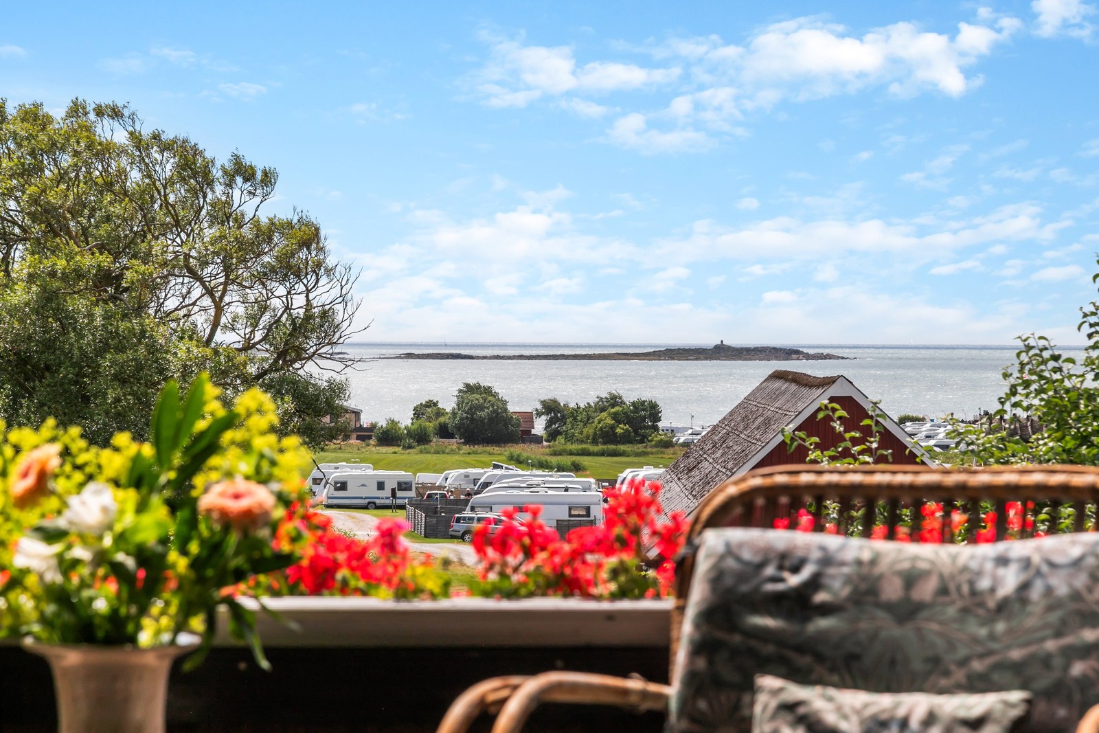 På övervåningen, i soligt söderläge, möts du av ett fantastiskt allrum med stora fönsterpartier som bjuder in havets glittrande vyer över både Apelviken och Rödskär. Härifrån når du även den rymliga inglasade balkongen – en underbar plats för avkoppling, stilla morgonkaffe eller sköna kvällar med utsikt oavsett väder.