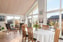 Ett par trappsteg ned från allrummet ligger vardagsrummet med gott om plats för matgrupp, fåtöljer och övrigt möblemang. Härifrån öppnas skjutpartierna upp mot uteplatsen och trädgården. I den vitlaserade träpanelen i taket döljer sig fyra stjärntecken som lyser upp kvällstid.
