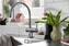 Kök och vardagsrum möts i en öppen och inbjudande planlösning med parkettgolv och vitmålade betongväggar. Köket från Marbodal är smakfullt inrett med grå luckor, bänkskiva i mörkgrå laminat och vitt kakel på stänkytorna. Den maskinella utrustningen i rostfritt från Siemens (2020) består av kyl/frys, fläkt (kolfilter), glaskeramikhäll, inbyggnadsugn och inbyggnadsmikro. Ovan diskhon sitter ett fönster som släpper in fint ljus och ger en trivsam arbetsmiljö. Framför köksdelen finns gott om plats för matbord och längre in i rummet finns en självklar plats för soffgruppen, där du enkelt möblerar för en ombonad och social vardagsrumsdel.