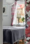 Badrummet är praktiskt utformat med plastmatta på golvet och våtrumstapet på väggarna, lättskötta material som gör rummet både funktionellt och hållbart. Här finns wc, handfat med kommod, spegel, vägghängt skåp och dusch. Ett fönster bidrar med naturligt ljus.