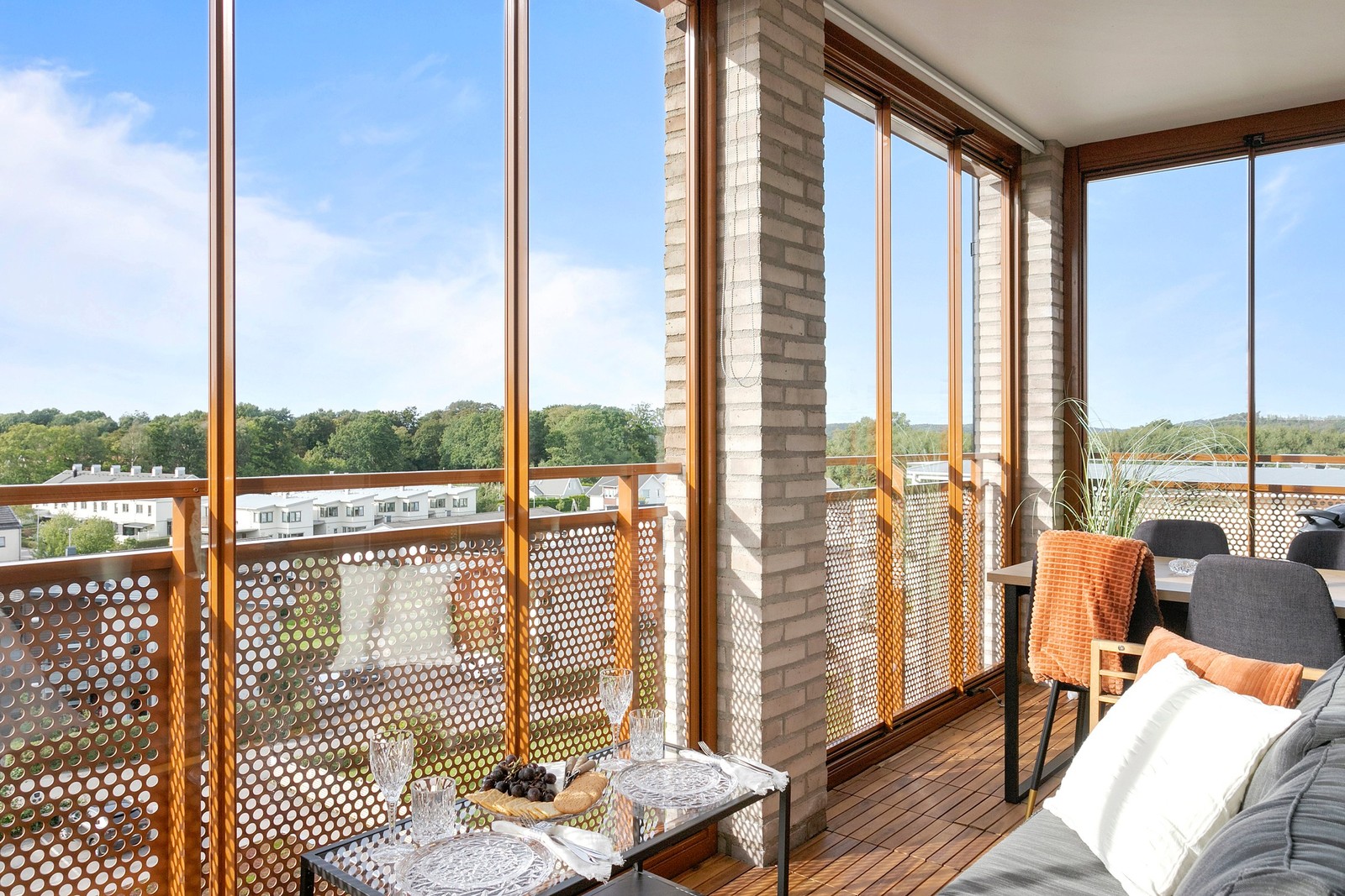 Intill lummiga skogsområden och gröna ängar ligger denna moderna gavellägenhet med inglasad balkong i västerläge. Bostaden är smart planerad och har en smakfull interiör. Köket från Marbodal har en öppen planlösning mot vardagsrummet och bjuder in till socialt umgänge. Köksön ger dig extra förvaringsutrymme och arbetsyta, samt en bra matplats. Via infällda, dimbara spotlights i fönstersmygen ges ett fint ljus under mörka kvällar. Den inglasade balkongen blir en skön förlängning av sällskapsytorna och bjuder på eftermiddags- och kvällssol. Badrummet är helkaklat och försett med både tvättmaskin och torktumlare. Sovrummet är väl tilltaget och har en praktisk skjutdörrsgarderob längs med ena väggen.