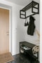 Ljus och välkomnande entréhall med blanka klinkerplattor på golvet och vitmålade väggar. Plats för avhängning på vänster sida samt förvaring i garderob med skjutdörrar.