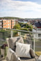 Generös balkong med morgon och eftermiddagssol. Glasräcke och klinkergolv.