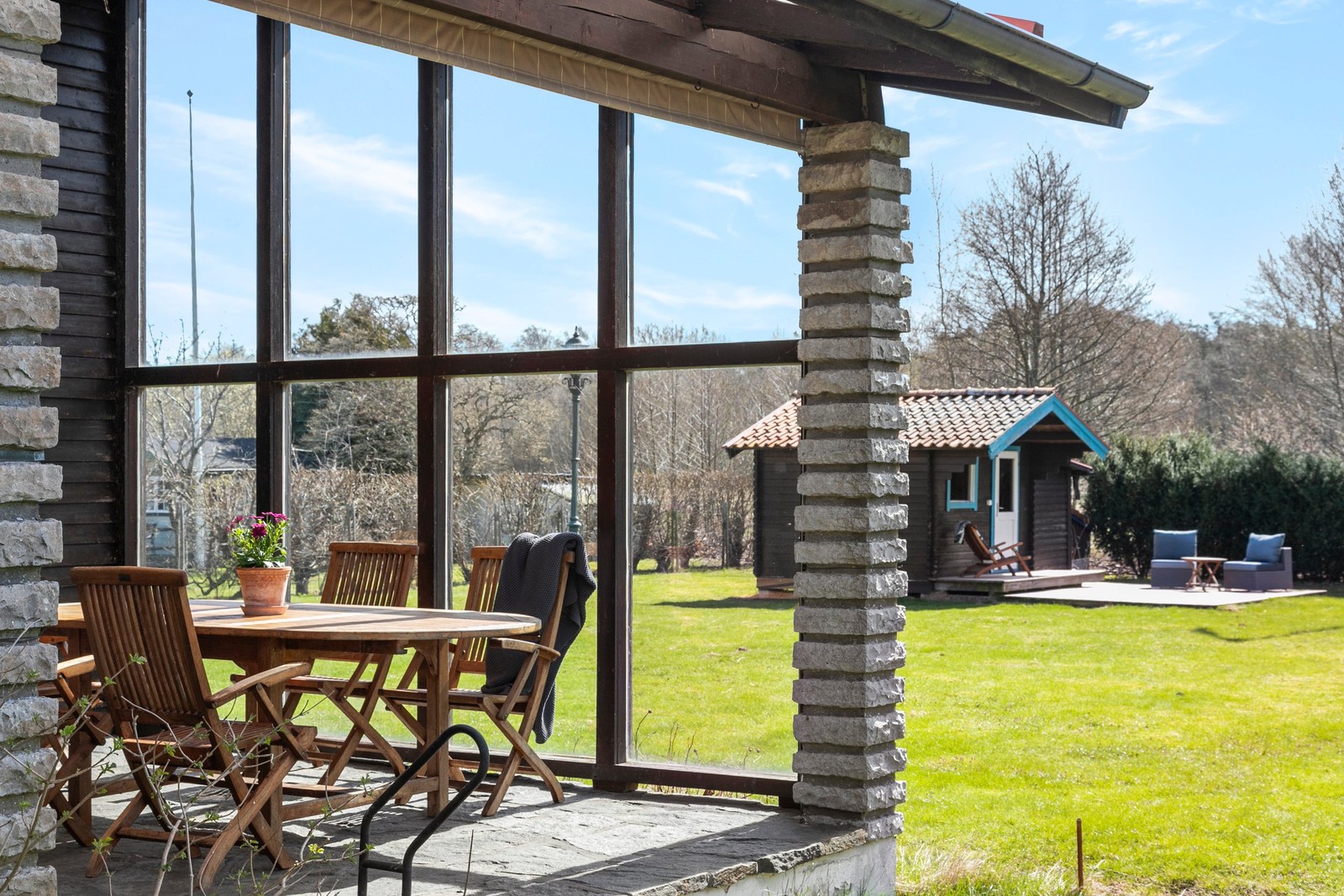 Vardagsrummet samlar huset kring spisen, och den skyddade uteplatsen med glasväggar förlänger utelivet långt bortom sommaren. Tre sovrum, kök, badrum och tvättstuga ger en bra grund – och den som ser möjligheter snarare än ytskikt kommer att trivas med vad som finns att jobba med här.