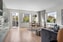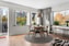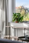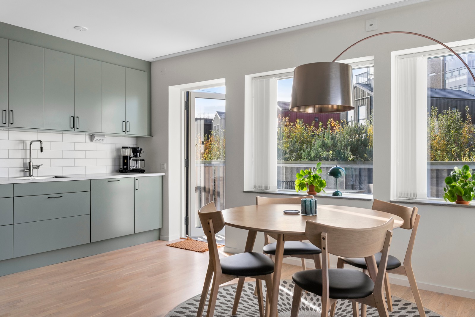 Köket från Marbodal är modernt och har genomtänkta funktioner. Släta luckor i en dov grön kulör, bänkskiva i laminat och vitt kakel på stänkpanelen. Här har tillval gjorts i form av bland annat infällda spotlights, uppgraderad fläkt samt rostfria vitvaror. Den maskinella utrustningen består av inbyggd ugn och mikro, integrerad diskmaskin samt kyl och frys. Tack vare bostadens gavelläge är rummet ljust och luftigt, med gott om plats för både soffa och matbord. Golvet pryds av vitpigmenterad ekparkett och väggarna är målade i en ljus kulör. Gardinskenor i tak, anpassade efter rummet, samt lamellgardinerna i fönstren stannar kvar i bostaden.