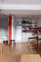 Kök och vardagsrum i öppen planlösning, köket är utrustat med kyl/frys, spis/fläkt, diskmaskin och microugn,