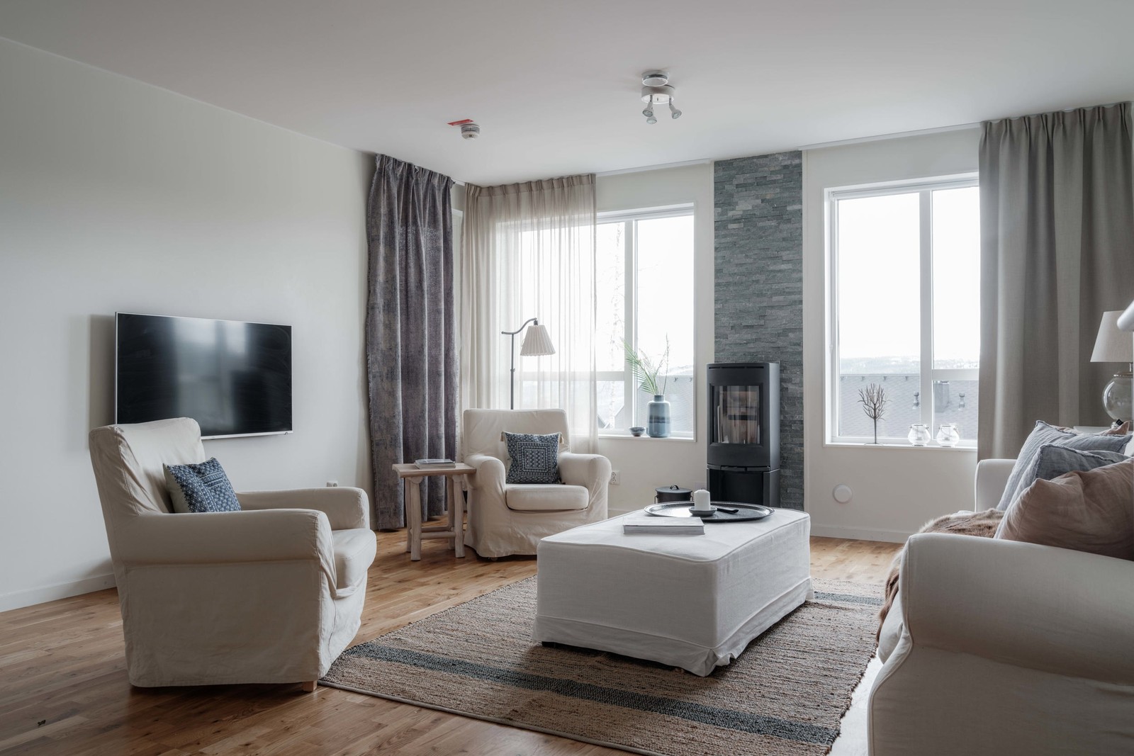 Planlösningen är tilltalande och väl genomtänkt med två sovrum om totalt sex bäddar, ett badrum med bastu, samt en rymlig yta med kök och allrum i social öppen planlösning, här i rummet finns också en kamin strategiskt placerad i rummet som hjälper till höja mysfaktorn i lägenheten.