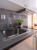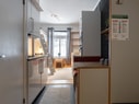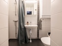 Badrummet är utrustat med wc, tvättställ, torkskåp och dusch. Vidare genom hallen finner vi köket till vänster och smart platsbyggd matplats till höger samt inbyggd micro och ugn.