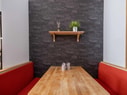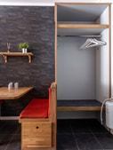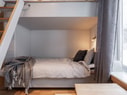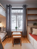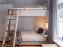 Längst in i rummet finns platsbyggd våningssäng till vänster och bäddsoffa till höger.
