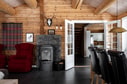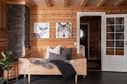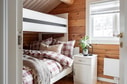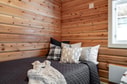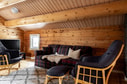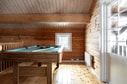 En trappa leder upp till loftet som rymmer en soffhörna och ett biljardbord samt utgång till balkongen. Här finns också stugans resterande två sovrum, båda möblerade med våningssängar.