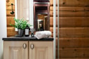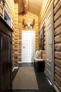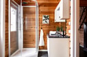 Hall med plats för avhängning i praktisk skjutgarderob. Direkt till vänster ligger ett badrum utrustat med handfat, duschkabin , wc och tvättmaskin. Vidare in kommer ett rymligt kök utrustat med spis, spisfläkt, diskmaskin samt kyl och frys. I köket finns plats för ett mindre matbord. Till höger från köket ligger ett rymligt allrum med öppet till nock vilket ger en härlig känsla av rymd. Rummet rymmer soffhörna, matplats samt fåtöljer vid en värmande braskamin. Härifrån finns också utgång till altanen med badtunna.