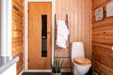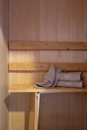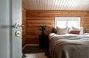 Till vänster från köket ligger entréplanets tre sovrum, varav två lite större möblerade med dubbelsängar och det tredje lite mindre med enkelsäng. Samtliga med förvaringsmöjligheter. Här ligger också det andra badrummet med bastu. Förutom bastun är badrummet utrustat med handfat, duschkabin och wc. Härifrån finns även utgång till uteplats för att ta en nypa luft efter att man bastat. Båda badrummen har klinker på golven.