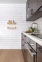 Slutligen kommer vi till lägenhetens sociala yta med kök och vardagsrum i öppen planlösning.