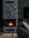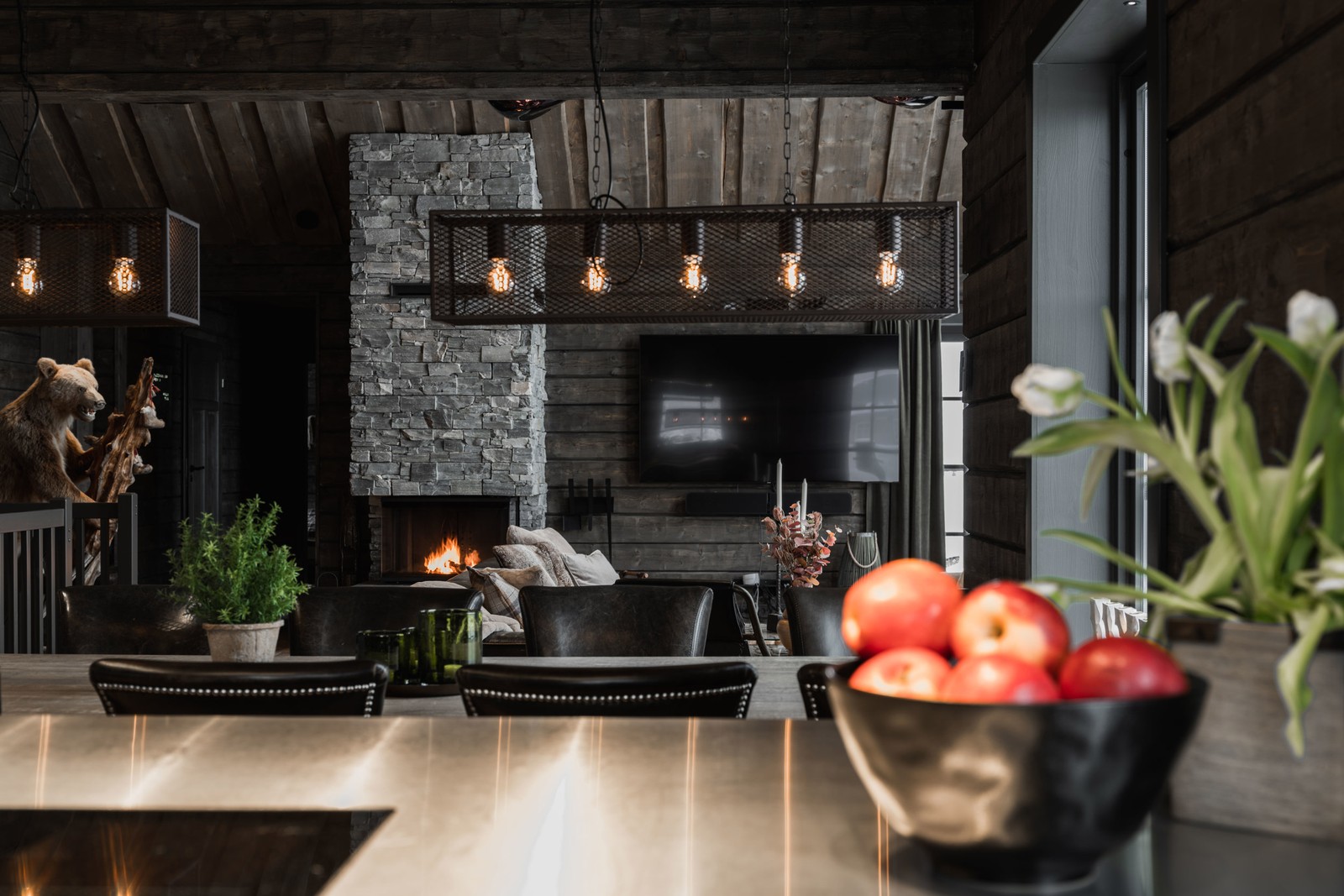 Nu överraskar huset totalt med entréplanets enorma storstuga där sadeltaket i timmerpanel reser sig högt upp till nock. Kortväggens närmast heltäckande glaspartier följer också med upp, och avslöjar det höga läget och den spektakulära utsikten ner över fjällvärlden. Känslan av höjd, yta och riktigt stor rumsvolym är omedelbar. Björkveden sprakar redan i den öppna spisen som är klädd i sten. Härinne finns plats för mycket stora sällskap. Den vackert patinerade ekparketten i trestavsläggning tar ut svängarna och sveper in i det stora köket i öppen planlösning. Köket får karaktär av den stensatta kortväggen och den traditionella stilen bryts lika smakfullt som exklusivt av närmast minimalistisk inredning och design. Tonen går i sobert mattsvart med arbetsytor i rostfritt. En köksö delar av mot matplatsen med plats för stadiga frukostar med många runt bordet.