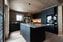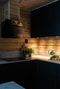 Det sobra köket från Ballingslöv går i mörka toner och harmoniserar fint med timmerpanelen på väggarna. Här finns det gott om plats för flera kockar att skapa kulinariska upplevelser tillsammans. Köket är utrustat med helintegrerade vitvaror som induktionshäll, fläkt, kyl och frys, mikro, diskmaskin och vinkyl.