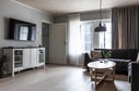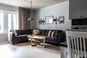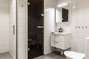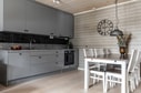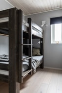 Vidare in i lägenheten kommer du till vardagsrum, kök och matplats för 6 personer. Här får du en öppen planlösning där fönsterna vetter ut mot verandan med utsikt över skidbackarna i sydväst. Köket från Ballingslöv är utrustat med diskmaskin, kombinerad kyl/frys, kombinerad ugn/mikro, induktionshäll och köksfläkt. Vitvarorna är från Siemens. Badrummet är utrustat med dusch, bastu, wc och handfatskommod. Det finns också en gäst wc. Total inrymmer bostaden tre sovrum varav ett som är inrett med dubbelsäng och de två andra med våningssäng.