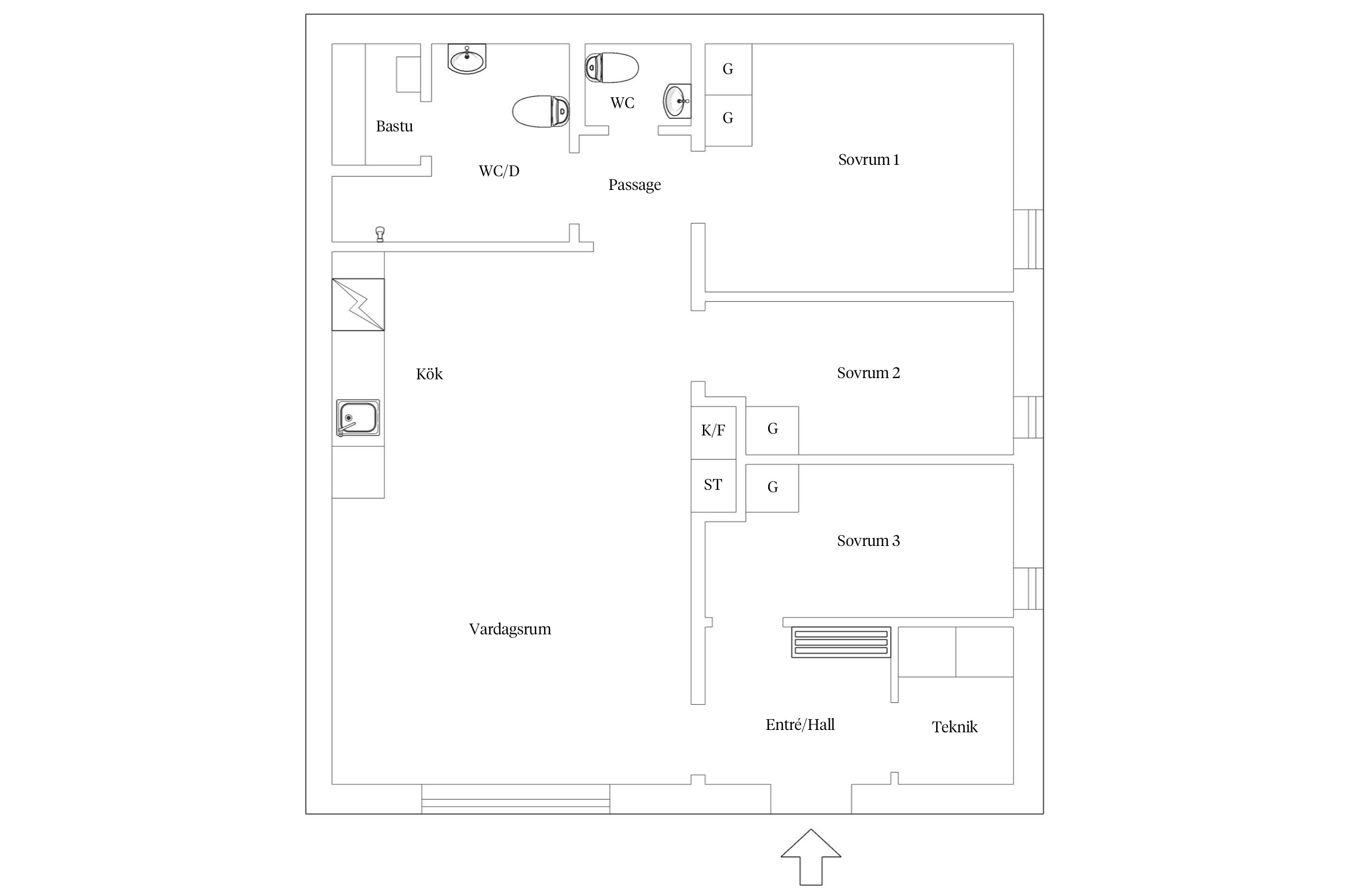 Entrén sker från framsidan av huset via den soliga verandan. Här finns ett intill liggande skidförråd vilket gör accessen till och från backen väldigt smidig. Hallen är generös med goda förvaringsmöjligheter och från hallen når du direkt ett sovrum med våningssäng samt ett torkrum där du kan hänga undan blöta funktionsplagg. Här finns även tvättmaskin och frånluftsvärmepumpen placerad.