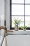 Lyxigt badrum med spakänsla. Intill master bedroom med klinkergolv och kaklade väggar i marmorerad vit och grå nyans njuter ni av en lång dusch och timmar i bastun eller badkaret som ger sjöglimt genom de genomtänkta glaspartierna. Handfatskommod, spegel med belysning samt bastu med ångfunktion från Tylö, kranar från Tapwell, vägghängd WC och spotlights i tak. Ytterst genomtänkt och stilsäkert badrum