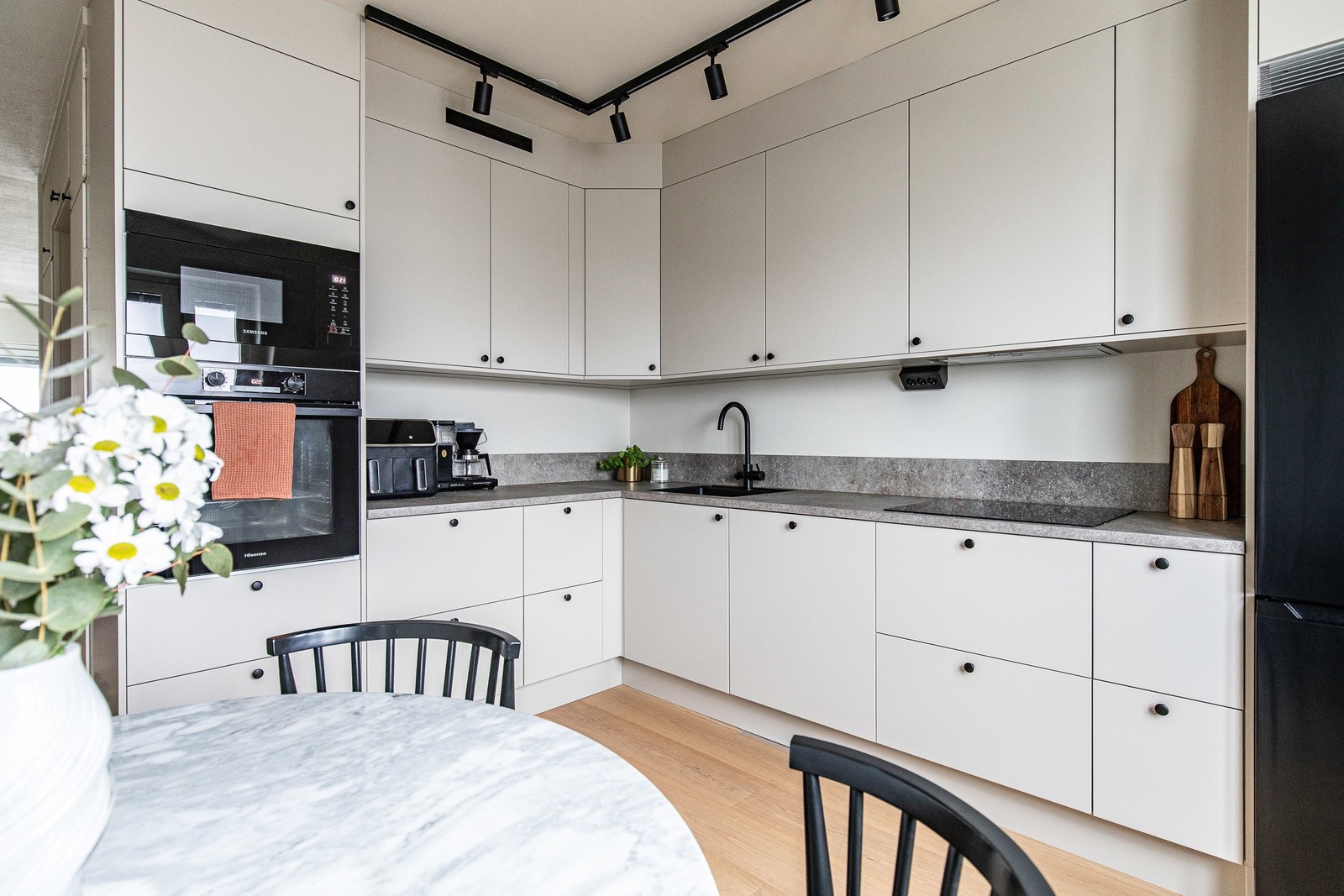 Detta nya och fräscha marbodalköket bjuder på moderna materialval av hög kvalitet. De släta, beiga luckorna kombineras med eleganta svarta knoppar som skapar en snygg och exklusiv kontrast - en färgkombination som följer lägenheten genom svarta eluttag, lampknappar, vitvaror och kran. Bänkskivan i stilren laminat har matchande stänkskydd och kompletteras av induktionshäll och integrerade vitvaror. Här finns gott om plats för ett matbord och tack vare öppnade dörrkarmar och tröskelfria övergångar flyter köket sömlöst samman med hemmets övriga rum.