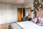 Rymligt sovrum med gott om plats för en stor säng, tillhörande möblemang och även skrivbord för den som önskar en arbetsplats i hemmet. Längs ena väggen finns en generös garderobsvägg som erbjuder utmärkt förvaring för allt du behöver. Rummet har ljusa väggar och ett ljust golv som tillsammans skapar en luftig känsla, medan en blommig fondtapet tillför värme och karaktär.
