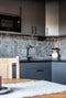 Nyrenoverat kök med mörkgrå luckor, matchande kakel och laminatbänkskiva. Utrustat med spishäll, ugn, fläkt, inbyggd mikro och kombinerad kyl/frys.
