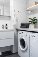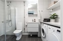 Ljust och fräscht badrum med klinkergolv och kaklade väggar. Badrummet är modernt utrustat med: Dusch med vikbara glasväggar, handfat med underskåp, WC, golvvärme, arbetsbänk där det finns både tvättmaskin och torktumlare.