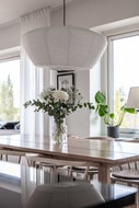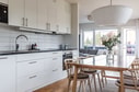 Ljust och välplanerat kök där den matlagningsintresserade trivs. Köket ligger i socialt öppen planlösning med vardagsrum och matplats. Härliga fönstersättningar mot det närliggande skogsområdet bjuder både in naturen och skapar etthärligt ljus till hela lägenheten. Vardagsrumsdel rymmer stor soffa och härifrån finns utgång till balkongen som erbjuder både utsikt och plats för utemöbler och grill. Köket är utrustat med fullstor kyl, fullstor frys, inbyggnadsugn, inbyggnads micro, fläkt, diskmaskin och induktionshäll. Stilrent matchande bänksiva i sten och gott om förvaring i skåp och lådor. Vita väggar och ekparkettgolv.