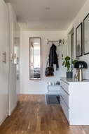 Välkomnande hall med plats för klädavhängning och bra förvaring i tre garderober. Här finns hatthylla och städskåp. Klinkergolv invid entrén och ekparkett längre in. Vita väggar.