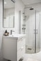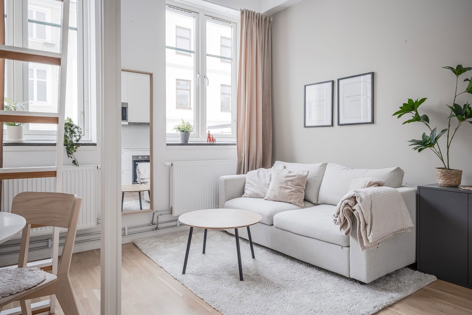 När du kliver in möts du av en välkomnande hall med utmärkt förvaring. Det stilrena, kaklade badrummet är utrustat med tvättmaskin och en dusch med vikbara glasväggar. Lägenhetens rum är optimalt planerat med ett fullt utrustat kök, plats för soffa, matplats och en loftsäng. Under loftsängen finns extra förvaringsutrymme. De stora fönstren och den generösa takhöjden skapar en ljus och luftig atmosfär, trots den mindre golvytan.