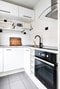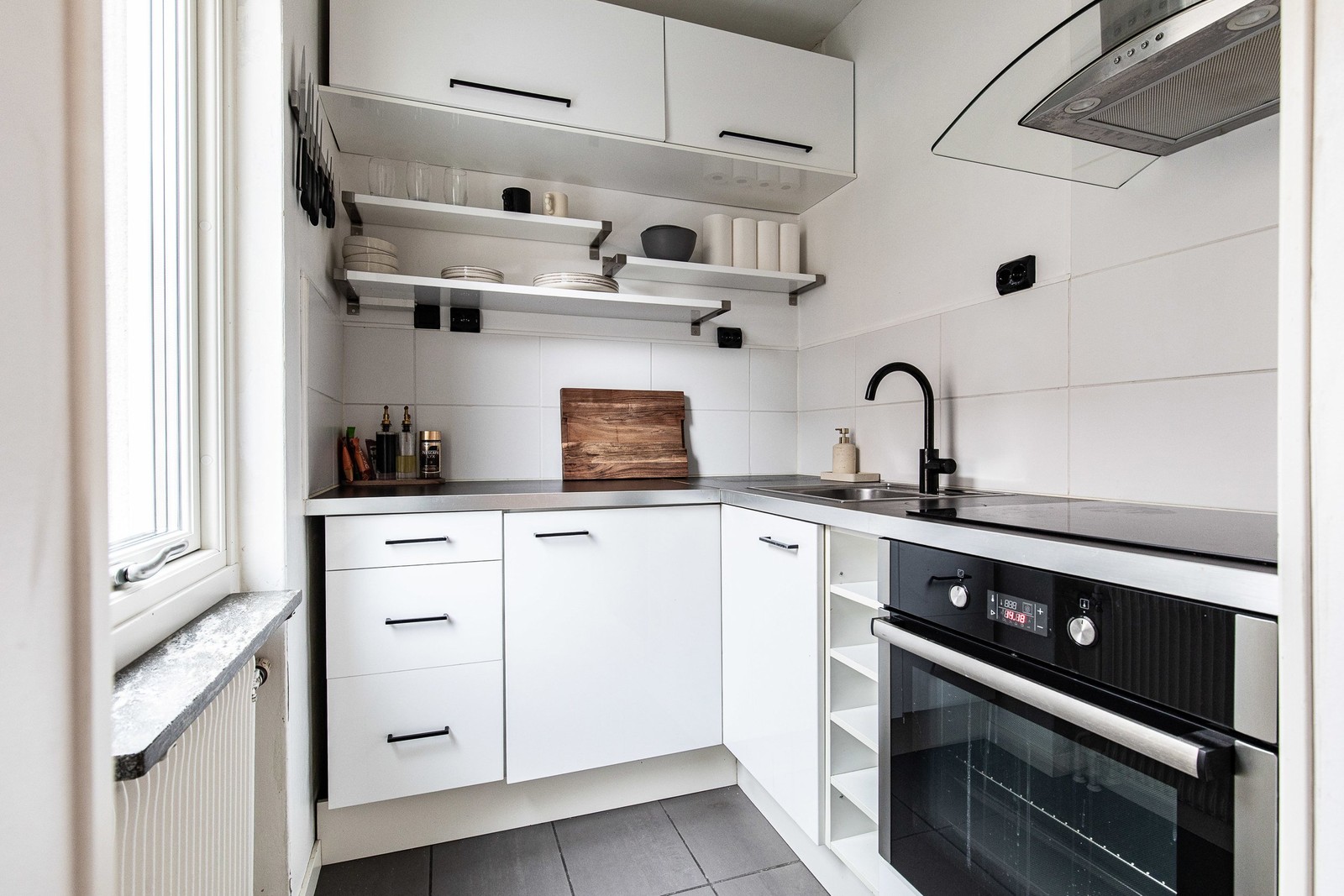Stilrent kök med vita skåpluckor, moderna beslag och generösa arbetsytor. Här finns gott om förvaring och plats för en mindre matgrupp. Köket är utrustat med ugn, spishäll, fläkt samt kombinerad kyl och frys. Vitt kaklat stänkskydd och ljusa materialval ger ett fräscht och tidlöst intryck – ett kök som kombinerar funktion med design.