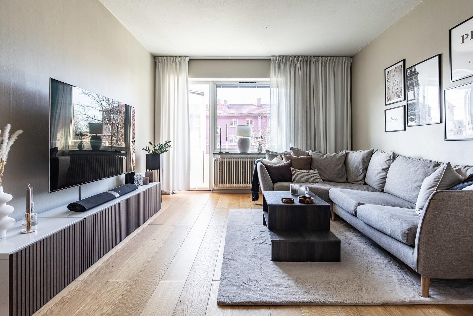 Köket är ljust och modernt med gott om arbetsyta och förvaring i stilrena skåp. De moderna vitvarorna gör matlagningen smidig och intill fönstret finns plats för ett matbord där morgonsolen gärna tittar in. Vardagsrummet bjuder in till både vila och umgänge med plats för soffgrupp, mediemöbler och kanske en liten arbetshörna. Ljusa väggar och vackert parkettgolv skapar en tidlös grund och från rummet nås den soliga balkongen – en härlig förlängning av bostaden där du kan njuta av morgonkaffet eller koppla av i eftermiddagssolen.