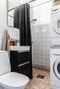 Smakfullt och helkaklat badrum med klinkergolv i stilren ton. Utrustat med duschhörna, kommod med handfat, spegel samt både tvättmaskin och torktumlare för extra bekvämlighet. Ett funktionellt och elegant badrum som kombinerar stil med vardagslyx.