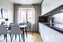 Ljust och modernt kök med stilrena skåpluckor, generösa arbetsytor och gott om förvaring. Här finns inbyggd diskmaskin, kombinerad kyl/frys, inbyggd ugn och mikro, spishäll samt effektiv köksfläkt – allt samlat i en praktisk och smakfull helhet. Belysningen består av dimbara spotlights i taket och under köksskåpen, vilket skapar både funktionellt ljus och en trivsam stämning. Ljusa väggar och parkettgolv förstärker det luftiga intrycket. Intill fönstret finns plats för ett matbord där morgonsolen lyser in och gör frukosten extra njutbar.
