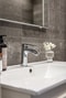 Modernt och stilrent badrum, helkaklat med stora grå klinkerplattor med golvvärme. Utrustat med dusch, WC, brett handfat med kommod med god förvaring, stor spegel och handdukstork - allt för en bekväm vardag.