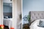 Ombonat sovrum med dubbelsäng, garderobslösning och en byrå. Enstavigt golv och en fin blå kulör på väggarna.