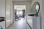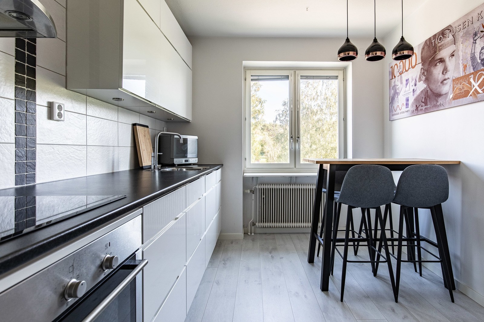 Det renoverade köket har vita luckor och matchande stenmönstrad bänkskiva i laminat och vita kaklade väggar med mörka detaljer. Maskinellt är köket utrustat med induktionshäll, varmluftsugn, spisfläkt, diskmaskin och kyl/frys kombiskåp med vinkyl. Vitmålade väggar och ljust laminatgolv.