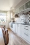 Ljust och funktionellt kök med laminatgolv, ljusa väggar och kakel i varierade nyanser. Ljusa köksluckor med överskåp i frostat glas samt grå laminatbänkskiva. Utrustat med spis med glaskeramikhäll och ugn, diskmaskin, fläkt samt modern kyl och frys. Gott om förvaring i skåp och generös plats för större matbord. Fint ljusinsläpp.