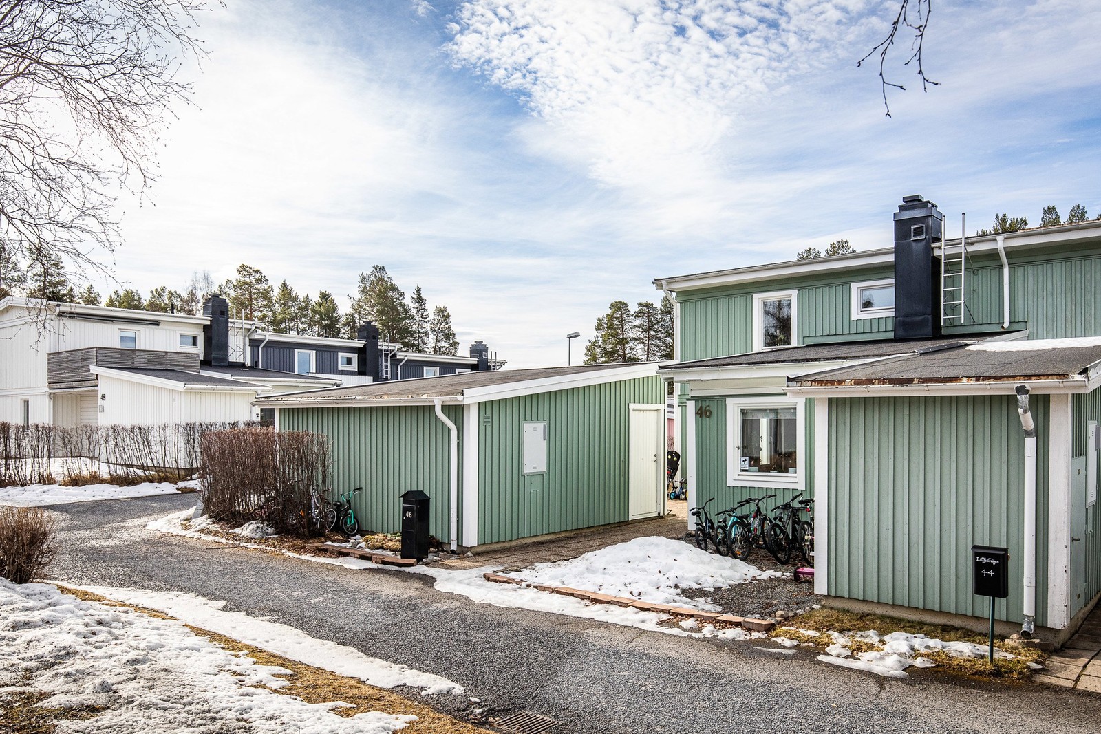 Utanför ytterdörren finns ett stort fristående förråd – unikt för området då det är dubbelt så stort som övriga förråd i radhuslängan. Ytan har smart delats upp i två delar, där den ena används som rymligt förråd med gott om plats för aktivitetsutrustning och säsongsförvaring.