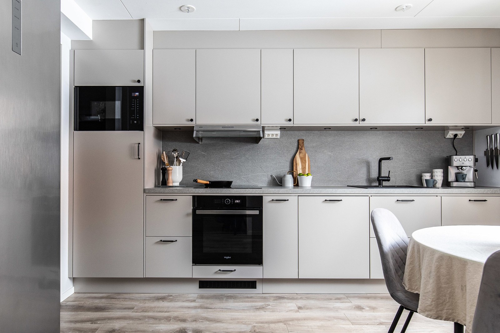 Magiskt kök som genomgått en omfattande och genomgående renovering där en vägg öppnats upp för att låta ljuset flöda genom hela bostaden. Köket är från Epoq i en stilren beige kulör och är fullt utrustat med fullstor kyl och frys, integrerad diskmaskin, ugn och mikro samt induktionshäll. Snygg laminatbänkskiva med matchande stänkskydd ger ett harmoniskt helhetsintryck.
