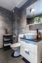 Nyrenoverat och stilrent badrum med praktisk och snygg grå plastmatta på golv och väggar. Utrustat med runt handfat med kommod, spegelskåp, wc samt dusch med glasvägg. Här finns även plats för ytterligare förvaring, vilket gör badrummet både funktionellt och välplanerat.