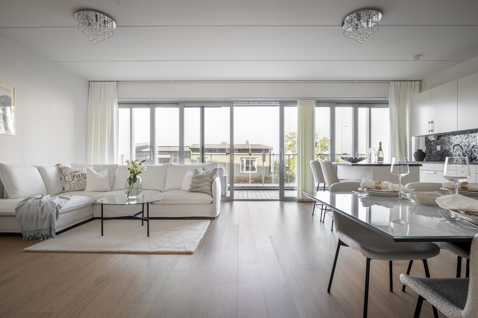 Bostaden erbjuder dessutom hög standard i varje detalj. HTH-köket är en riktig pärla med sina smarta och eleganta lösningar. Varje del av hemmet, från köksutrustning och vitvaror till färgval och förvaring, andas kvalitet. Badrummet är utrustat med moderna bekvämligheter och inglasningen på balkongen förtjänar ett eget kapitel – det skapar en extra dimension som gör hemmet till en oas året runt.
