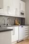 Lägenhetens kök har renoverats med stil och funktion i åtanke. Här finns moderna vitvaror, inklusive integrerad kyl/frys (-20), diskmaskin (-21), spishäll, fläkt, inbyggd mikrovågsugn och ugn – allt för att underlätta vardagen. Köksluckorna går i vitt och bryts snyggt av med en mörk laminatbänkskiva och stänkskydd i mörk mosaik. Här finns också plats för ett matbord där familj och vänner kan samlas.