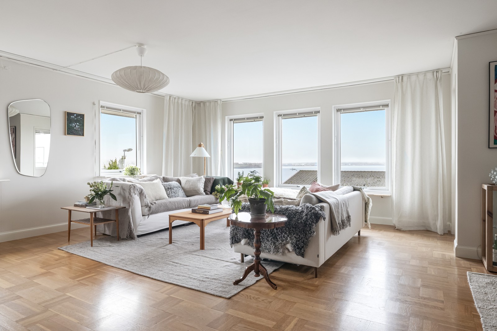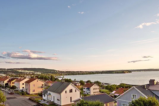 Trädgården är generös och lätt att tycka om med plats för både lek och odling och på ena sidan har nuvarande ägare byggt en altan som förlänger vardagsrummet ut i det gröna och bjuder in till långa sommarkvällar. Från balkongen på gaveln och vardagsrummets panoramafönster har man dessutom alltid första parkett till naturens färgspel i sol vind och vatten och det är en utsikt som snabbt blir en självklar del av livet snarare än bara en vy något man aldrig tröttnar på utan tvärtom snart inte vill vara utan.