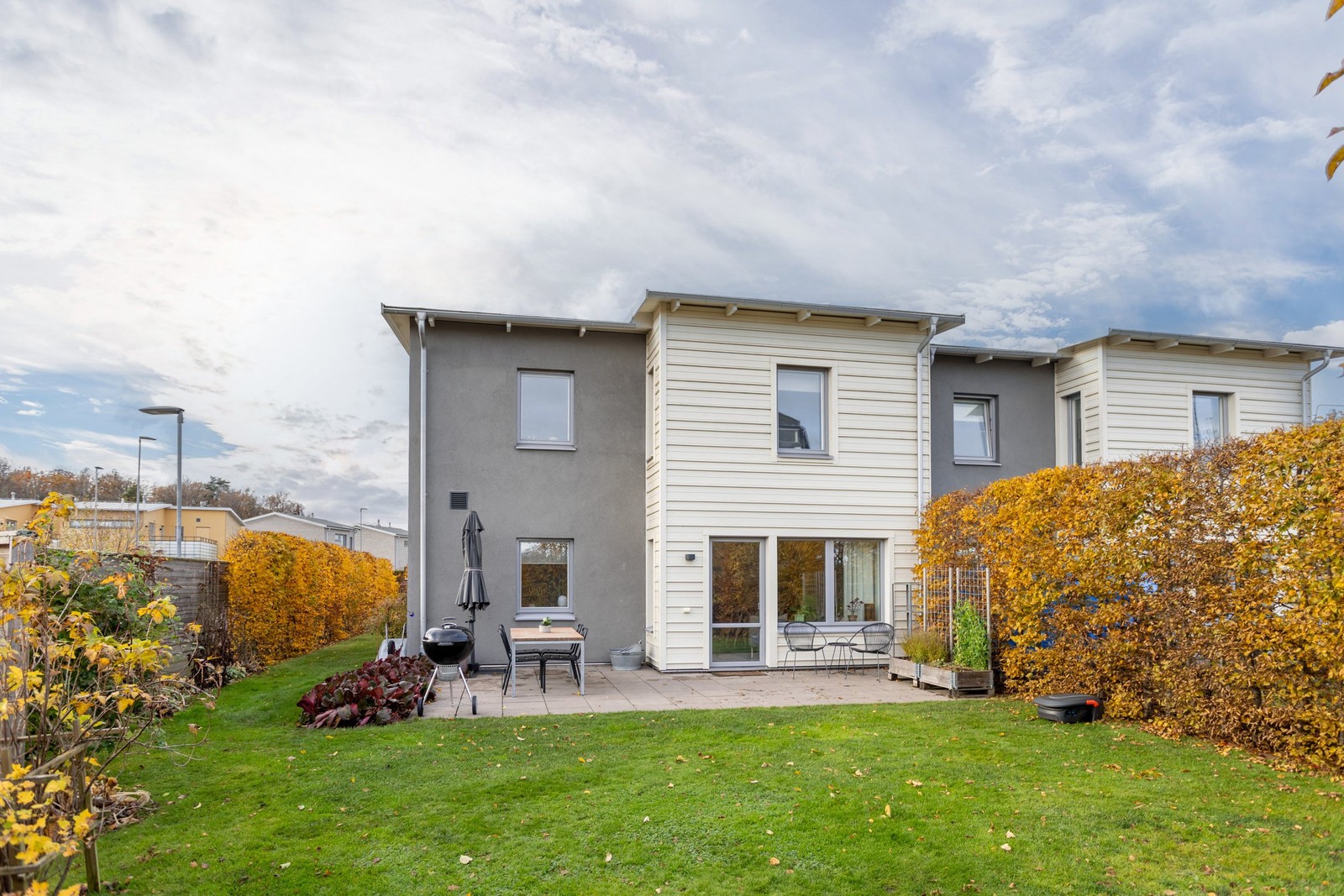Huset har flera välplanerade uteplatser och tack vare det fria kantläget kan du i stort sett följa solen runt hela huset under dagen. Baksidan är helt insynsskyddad med höga, välklippta buskage som ramar in både den stensatta uteplatsen och den generösa gräsmattan, vilket ger gott om plats för utemöbler, grill, studsmatta eller lek och spel.