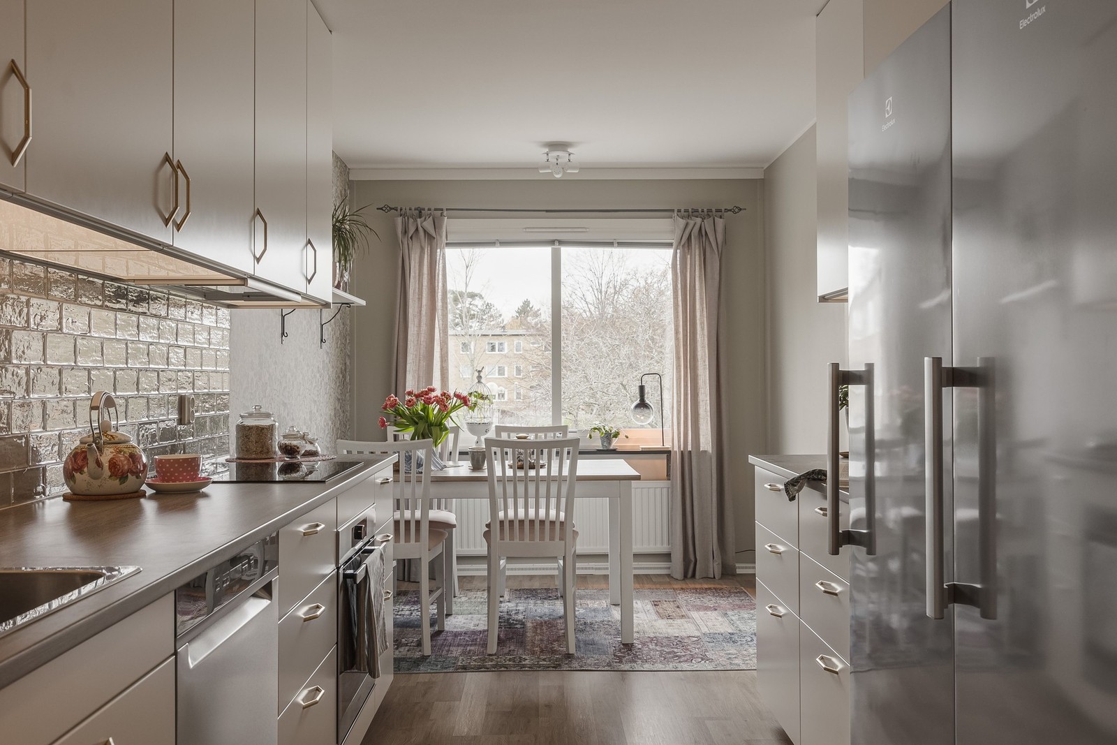 Köket är modernt och välutrustat, utformat för att både matlagning och gemenskap ska stå i fokus. Här finns ugn, spis, fläkt, kyl, frys och diskmaskin, samt gott om förvaringsutrymme och arbetsytor. Vid det stora fönstret finns en perfekt plats för matbordet, där du kan njuta av måltider i ett ljust och trevligt utrymme.