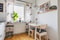 Luftigt och ljust vardagsrum som bjuder på parkettgolv och ljusa väggar samt grå fondvägg. Här finns plats för såväl större matgrupp som soffgrupp. Utgång till den inglasade balkongen som bjuder på härlig förmiddagssol.