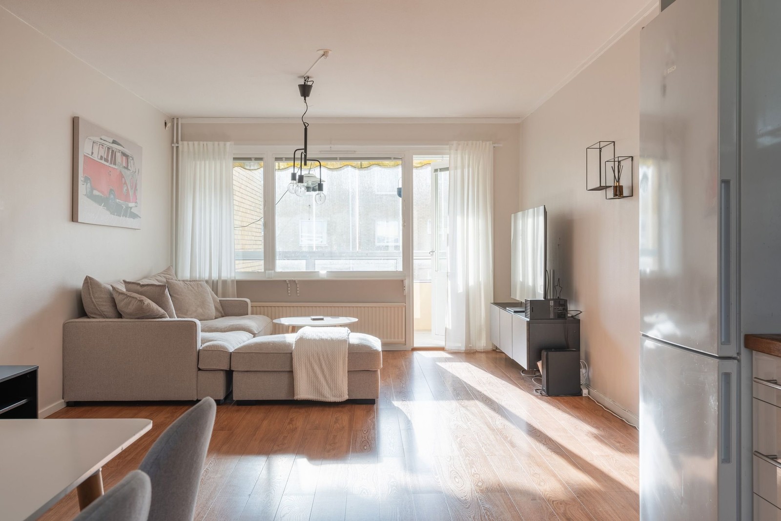 Luftigt och ljust vardagsrum som ger plats för större soffgrupp. Utgång till den inglasade balkongen i härligt västerläge.