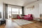 Luftigt och ljust vardagsrum med ljusinsläpp från två väderstreck. Utgång till den inglasade balkongen i härligt solläge.