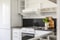 Rymligt och ljust kök med mönstrad fondvägg. Vit köksinredning och mörkt kakel ovan bänkskiva. Köket är utrustat med spis, fläkt, kyl/frys och diskmaskin. Här finns plats för större matgrupp, perfekt för när vänner och familj kommer över.